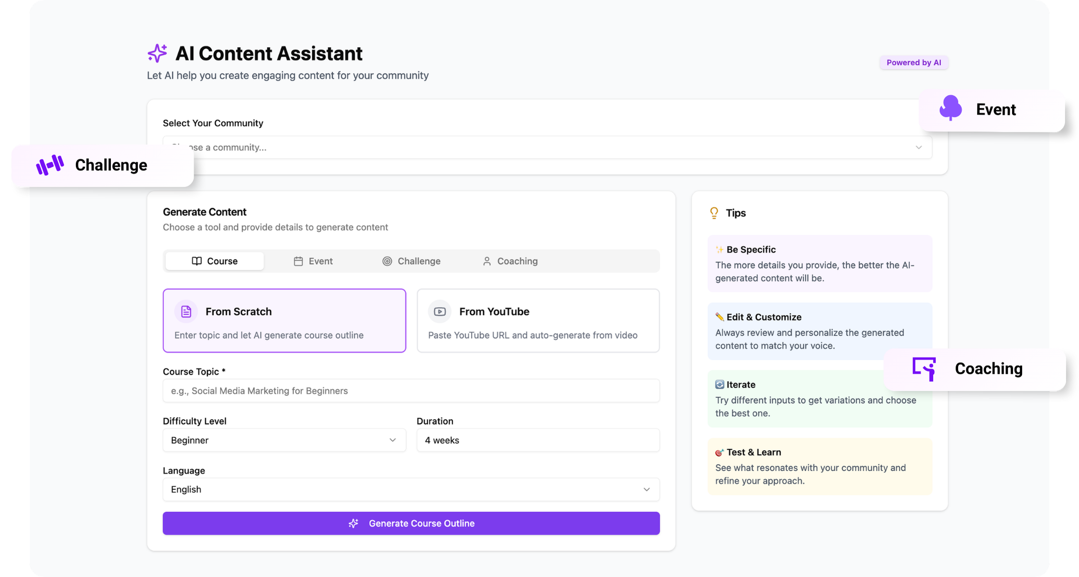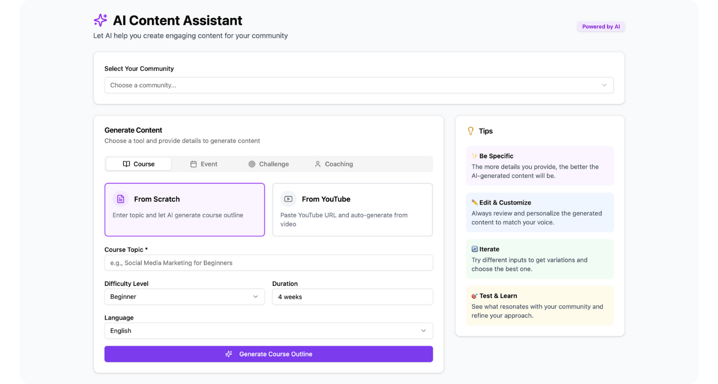 No blank canvas anxiety. No complex tech. Just follow our step-by-step guide, and let our AI assist you in building a professional community platform instantly.