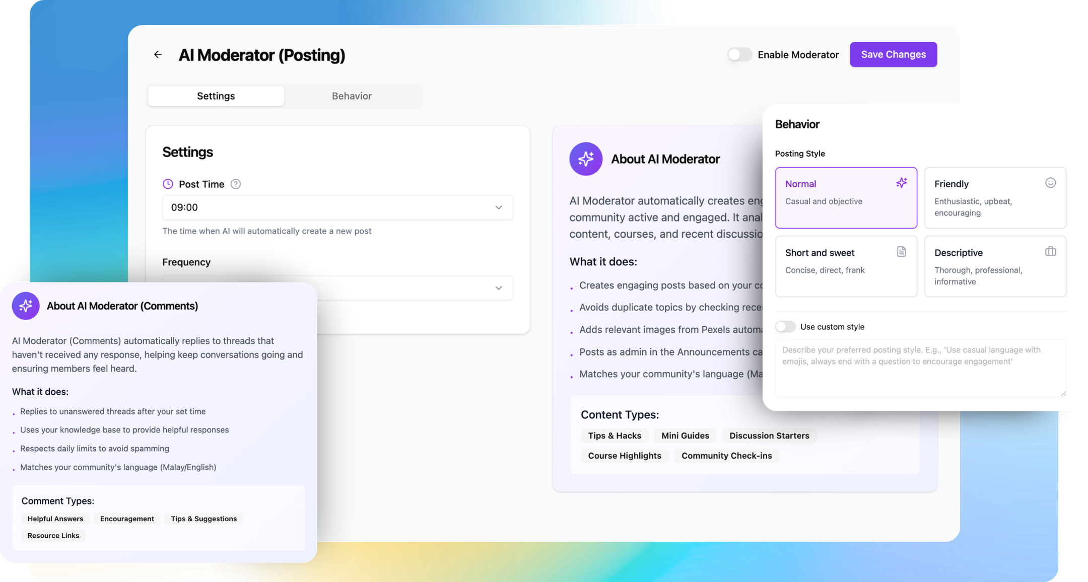 Meet your new 24/7 team. Our AI doesn't just moderate; it creates content, manages members, and keeps engagement high while you sleep.